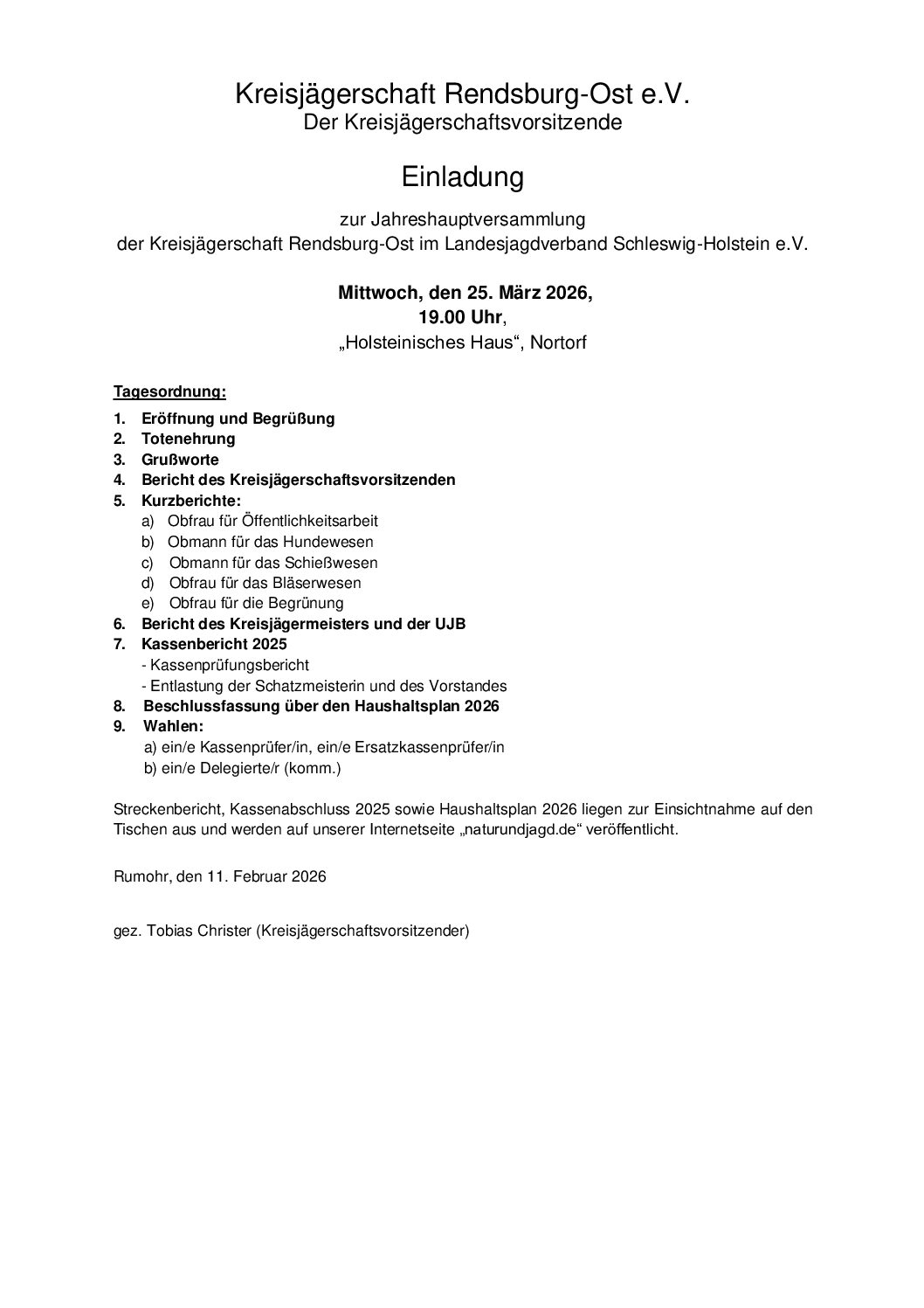 Die Jahreshauptversammlung ist ein wichtiger Bestandteil unseres Vereinslebens. Sie bietet Gelegenheit, gemeinsam auf das vergangene Jagdjahr zurückzublicken, aktuelle Themen zu besprechen und die Weichen für die kommenden Aufgaben zu stellen. Neben Berichten, Wahlen und Beschlüssen soll der Abend auch Raum für den persönlichen Austausch und das kameradschaftliche Miteinander bieten.